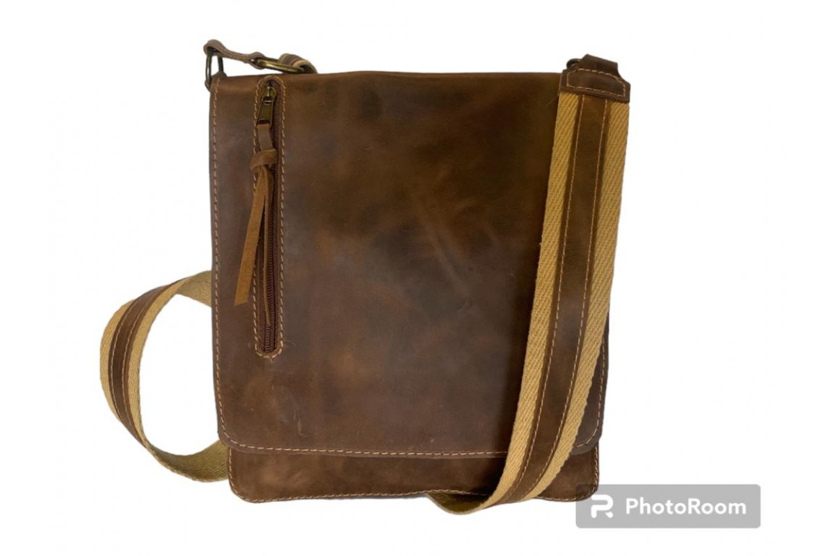 Morral en cuero genuino de selección, con correa larga de algodon suave, con cuero aplicacion de cuero, ideal para tablet, un cierre frontal y un cierre en la parte posterior, bolsillo porta celular y tarjetero, para el hombre actual.
