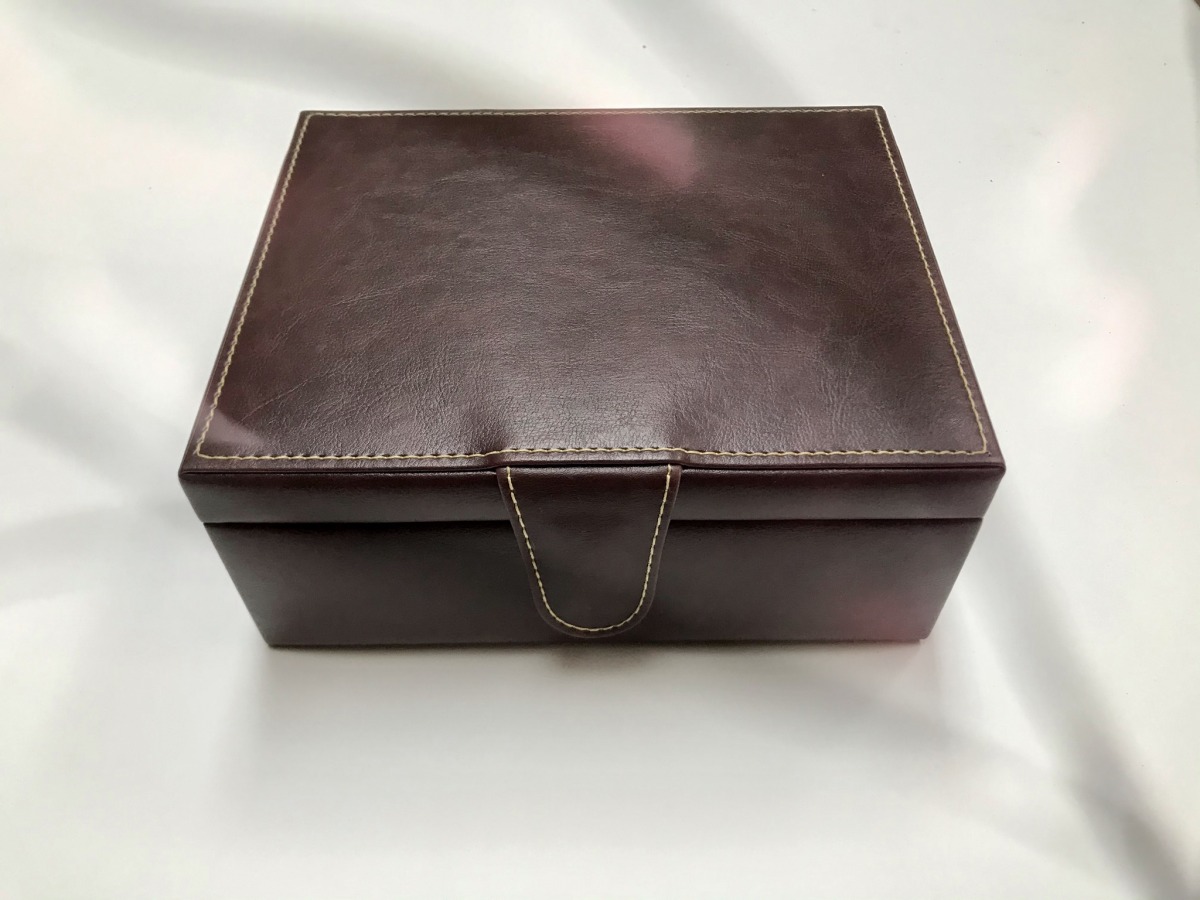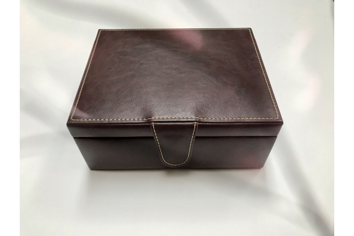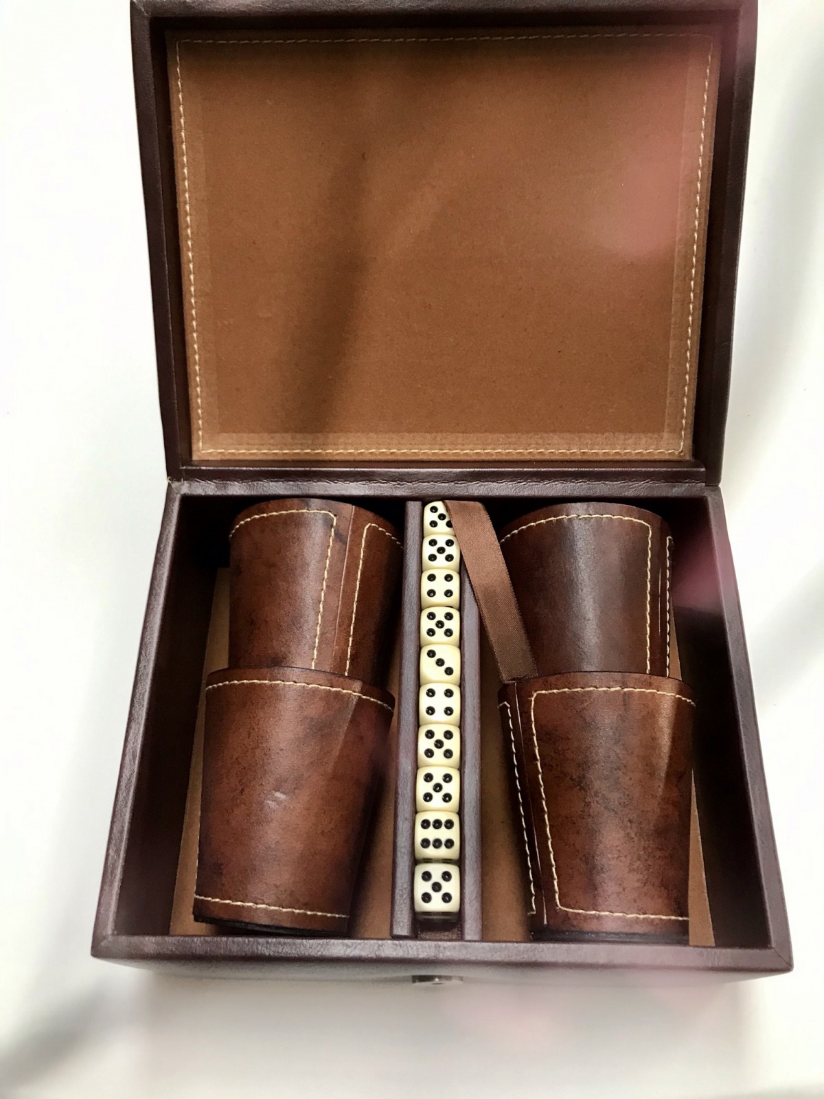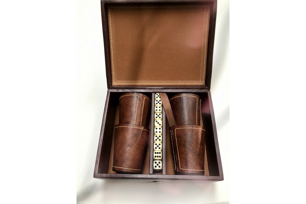 Caja de madera forrada en cuero o ecocuero, con 4 cachos en cuero genuino de selección, 20 dados, con logo en caja y cada cacho.